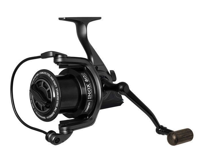 Delphin INOX präsentiert eine Reihe von Karpfenrollen, die auf den ersten Blick durch ihr dunkelgraues, mattes Design mit glänzend schwarzen Elementen beeindrucken. Abgerundet wird das elegante Design durch einen präzise gefertigten Holzgriff an der kurbel, der perfekt in der Hand liegt. Die INOX-Serie ist in zwei Versionen mit den Bezeichnungen 70D und 80D erhältlich. Der kleinere Bruder mit der Bezeichnung 70D hat kompaktere Abmessungen und ein geringeres Gewicht, was diese Rolle besonders für die Pirsch in kleineren Gewässern eignet. Die 80D ist eine Rolle mit hoher Kapazität, die dank ihres robusten Designs selbst die schwierigsten Herausforderungen auf Ihren Karpfenexpeditionen bewältigen kann. Es ist eine Rolle, die eine wirklich große Schnurkapazität hat. und somit das Angeln auch auf große Distanz zum Futterplatz ermöglicht. Mit dieser sind sehr weite Würfe kein Problem. Der Hauptunterschied, abgesehen von den Abmessungen, ist das Design der Kurbel. Die 80D ist eine bewerte, robuste Konstruktion, wobei die Welle vom Getriebe durch den Rollenkörper geführt wird und auf der gegenüberliegenden Seite mit einer Schraube festgezogen ist. Die Kurbel des 70D-Modells wird durch direktes Einschrauben in den Rollenkörper befestigt, sodass die Kurbel kein Spiel mehr hat. In beiden Modellen befinden sich 6 + 1 Edelstahlkugellager, die für einen reibungslosen ausgewuchteten Lauf sorgen. Der rotierende Kopf der Rolle ist mit Bürsten versehen, die verhindern, dass die Schnur unter die Spule gerät und sich nicht verwickeln kann. Beide Modelle haben ein Getriebe System mit einem langen Spulen Hub, die die Angelschnur Perfekt auf die Spule verlegt. Dank dieser Schnurverlegung wird die Schnur beim Werfen viel leichter von der Rolle abgewickelt. So sind weite Würfe kein Problem. Das Getriebe ist aus Edelstahl und Salzwasserbeständigkeit. Dies garantiert eine lange Lebensdauer und ist auch für den Einsatz beim Meeresfischen, Brandungsangeln, unter schwierigsten Bedingungen eine gute Rolle. Es gibt die Möglichkeit, tiefe oder flache Ersatzspulen zu dem Basispaket zu kaufen.